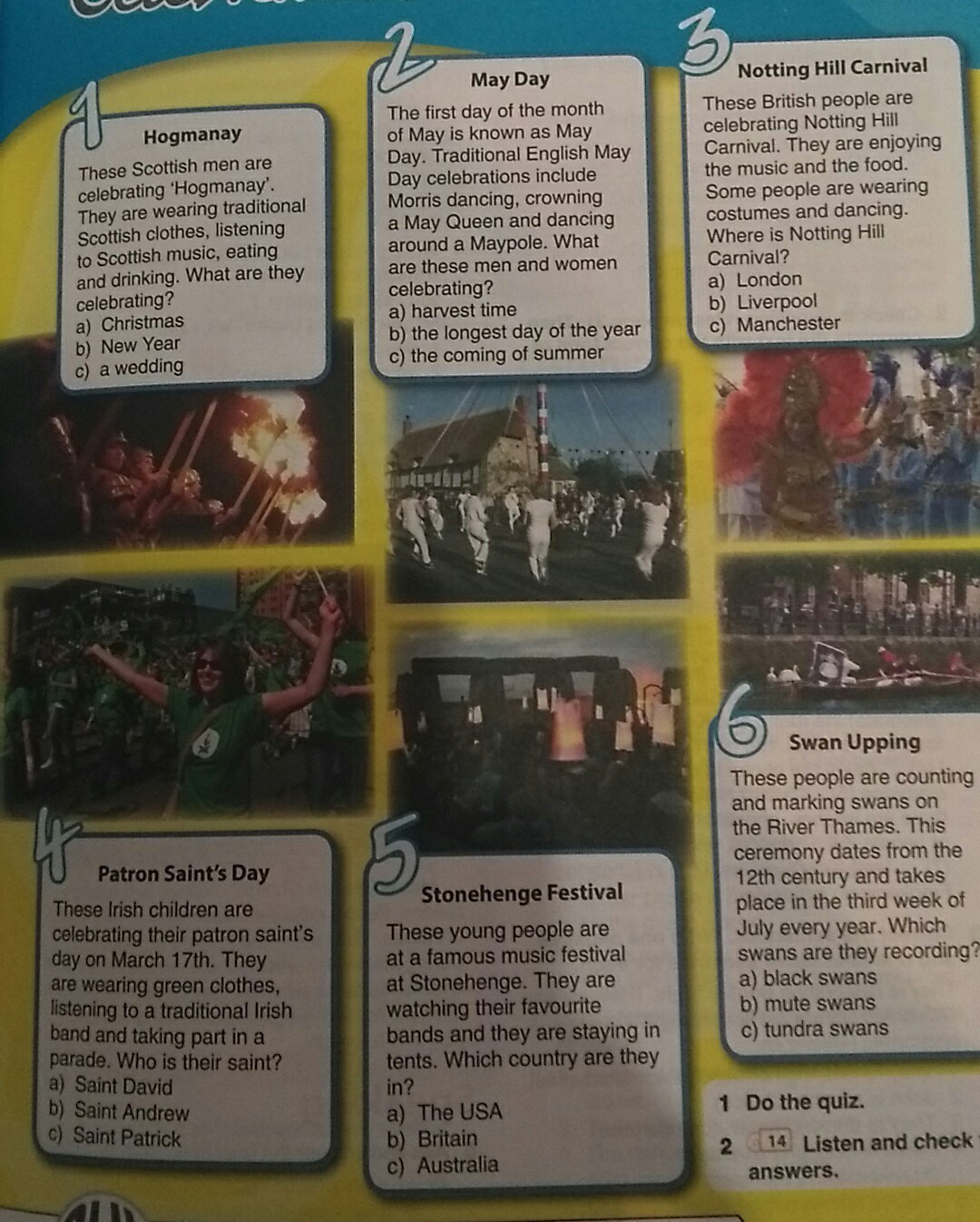 1.Эти шотландские мужчины празднуют Хогманай. Они носят традиционную шотландскую одежду, слушают шотландскую музыку, едят и пьют. Что они празднуют? А) Рождество б) Новый год c) свадьба