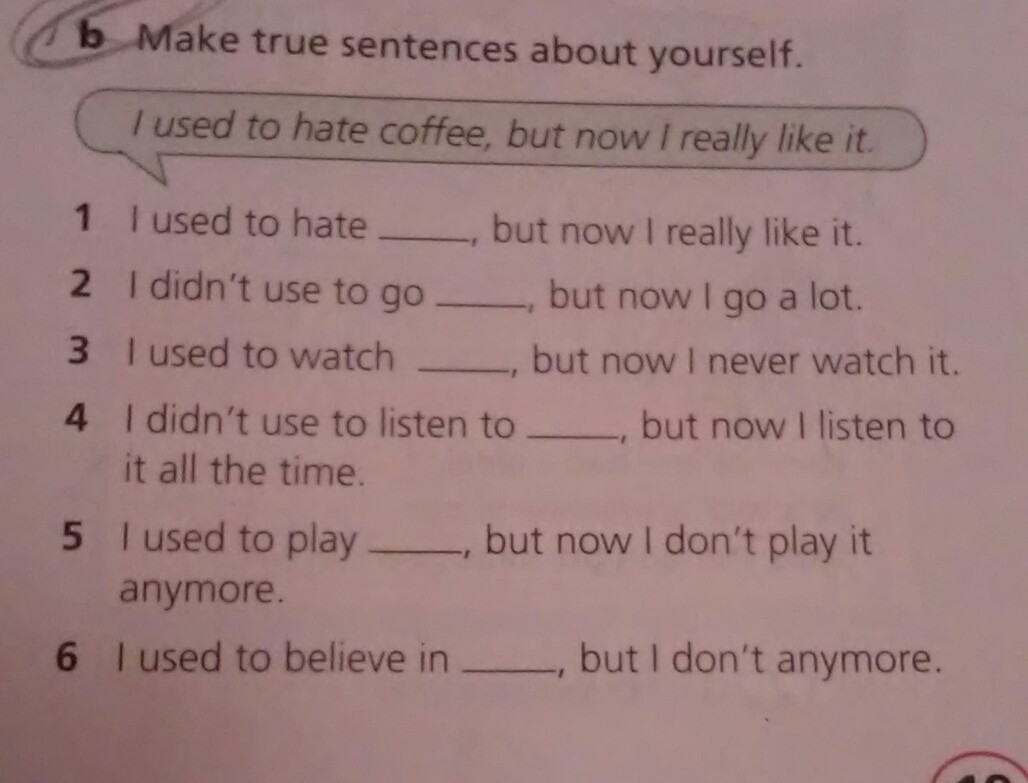 1. I used to hate tea, but now I really like it. 2. I didn't use to go a doctor, but now I go a lot. 3. I used to watch TV, but now I never watch it. 4. I didn't use to listen to the radio, but now I listen to it all the time. 5. I used to play the football, but now I don't play it. 6. I used to believe in my friend, but I don't anymore.