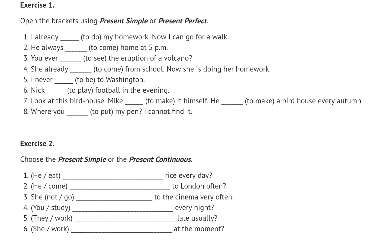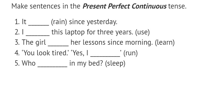 1. It is raining since yesterday. 2. I am using this laptop for three years. 3. The girl is learning her lessons since morning. 4. You looked tire. Yes, I am running. 5. Who is sleeping in my bed?