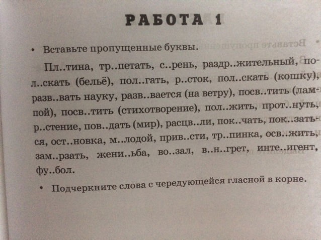 Платина,трепетать,сирень,раздражительный,полоскать (бельё),полагать,росток,полоскать,(кошку),развивать науку,развивается (на ветру),посветить(лампой),посвятить(стихотворение),положить,протянуть,ростение,повидать(мир),расцвели,покачать,показаться,остановка,молодой,привести,тропинка,освежить,замерзать,женитьба,вокзал,винегрет,интеллигент,футбол.