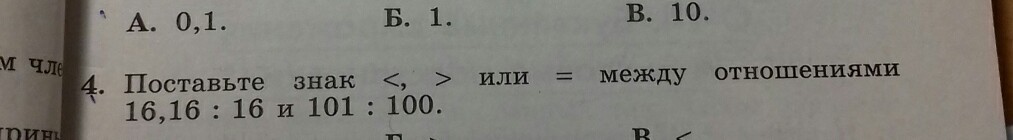 поставьте знак больше меньше или равно между отношениями 16,16 / 16 и 101/100