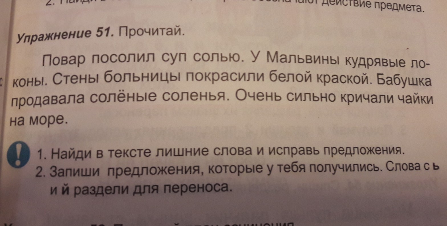 Повар посолил суп. У Маль-ви-ны локоны. Стены боль-ни-цы покрасили крас-кой. Бабушка подавала со-ленья. Силь-но кричали чай-ки на море. (перенос показан дефисом прям в словах)