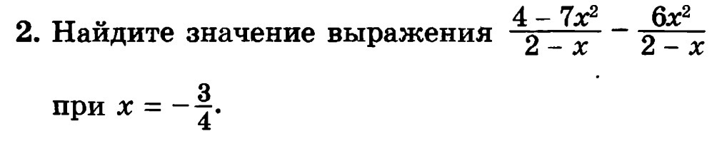 4-7x 2/2-x-6x 2/2-x=4-7x2-6x2/2-x=4-13x2/2-xПри х = -3/44-13·(-3/4)²/(2-(-3/4))=(4-13·(9/16))/(15/4)=(64-104)/16 ·(4/15)=-40·4/16·15==-10/15=-2/3