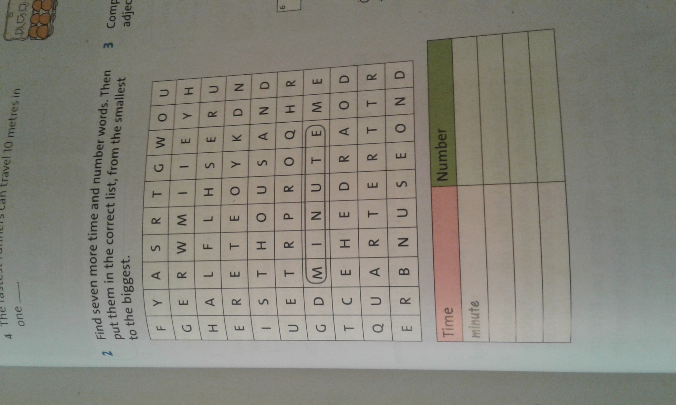 Time: minute,quarter, half, hour, week, years. Number: hundred, thousand.
