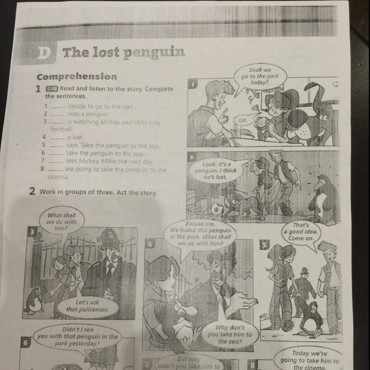 Потерянный пингвин. Пойдем ли мы в парк сегодня? 248 Читайте и слушайте рассказ. Закончите предложения. решите пойти в па, видит, что пингвин смотрит на Микки и Мини, и футболист проиграл. Возьмите пингвина в зоопарк, возьмите пингвина в зоопарк, увидев Микки, Милли на следующий день. Послушай, это будет пингвин для пингвина. Я думаю, он потерян. 2 работают в группах по три. Действуй рассказ. Что нам делать с Простите. Это он? Мы нашли этот пингвин хорошей идеей. в парке. Что будет дальше. мы с ним работаем? Давайте спросим этого полицейского. Почему я не видел, чтобы ты отвез его к себе с этим пингвином в