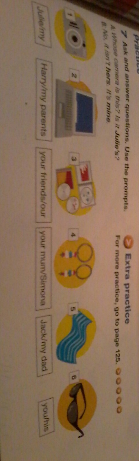 ПОМОГИТЕ ПОМОГИТЕ ПЖ ask and answer questions. Use the prompts. 1)Julie/my 2)Harry/my parents 3)yor friends/our 4)your mum/Simona 5)Jack/my dad 6)you/his