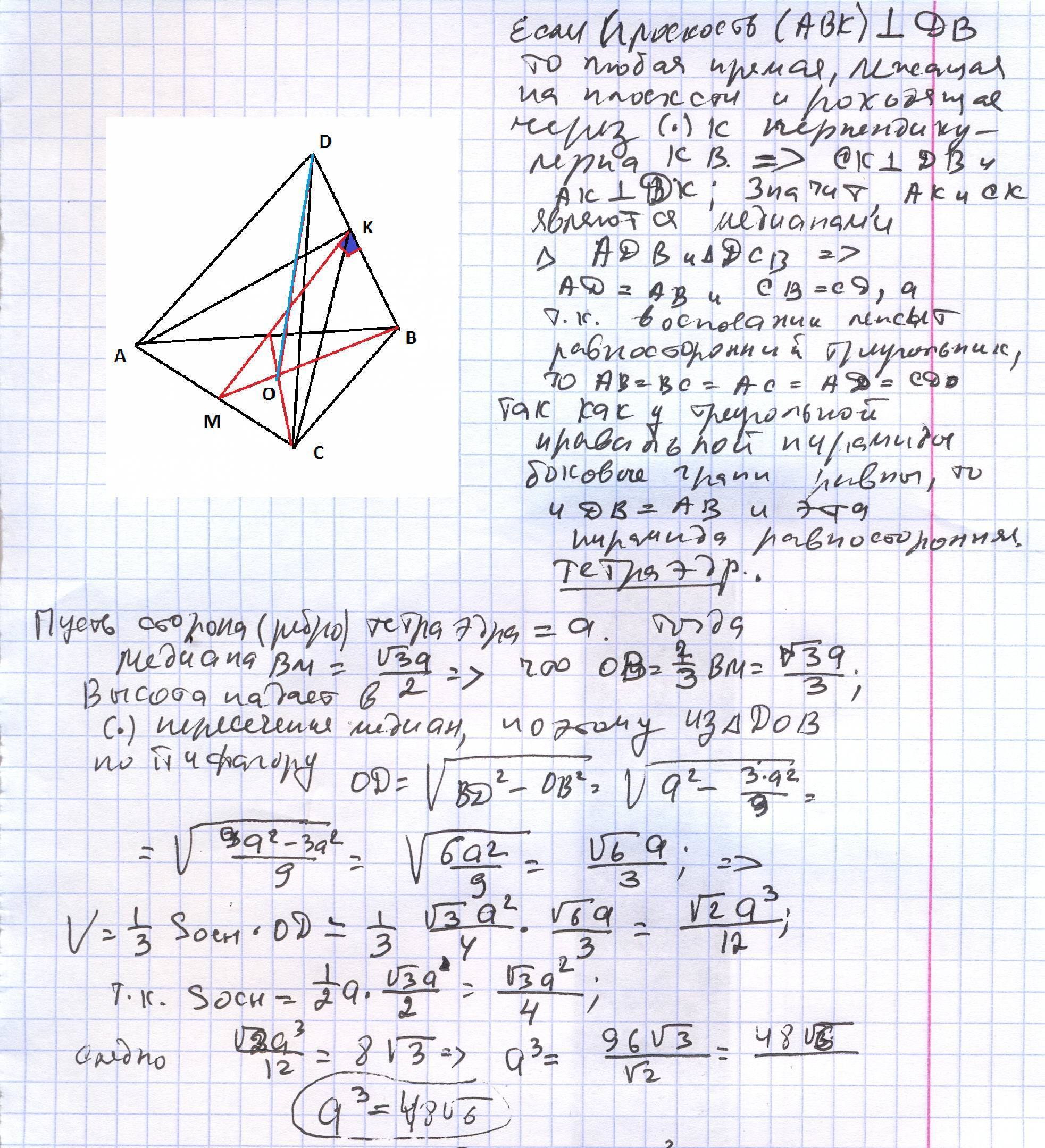 Объем правильной треугольной пирамиды равен 8 корень из трех, а плоскость, проходящая через сторону основания пирамиды и центр вписанного шара , перпендикулярна противолежащему ребру пирамиды. Найдите радиус вписанного шара.