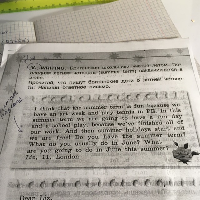 Я думаю эта летняя четверть веселая, потому что у нас есть неделя искусства и игра в теннис на физкультуре.В эту летнюю четверть мы собираемся провести веселый день и школьную пьесу, потому что мы заканчиваем всю нашу работу. И затем летние каникулы начнутся и мы будем свободны! У тебя есть летняя четверть? Что ты обычно делаешь в июне? Что ты собираешься делать в июне этим летом?