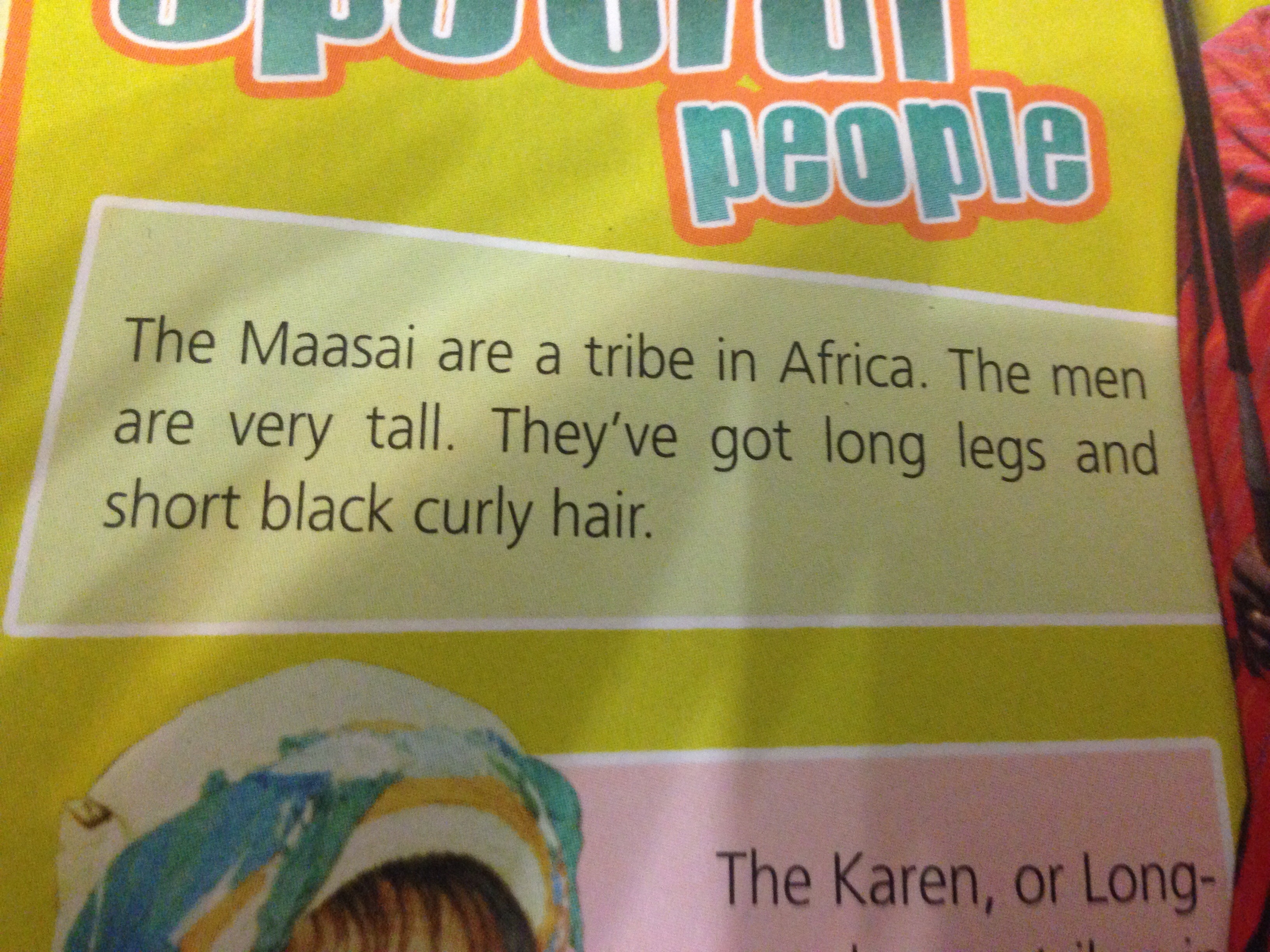 Масаи - это племя в Африке. Мужчины очень высокие. У них длинные ноги и короткие черные кудрявые волосы.