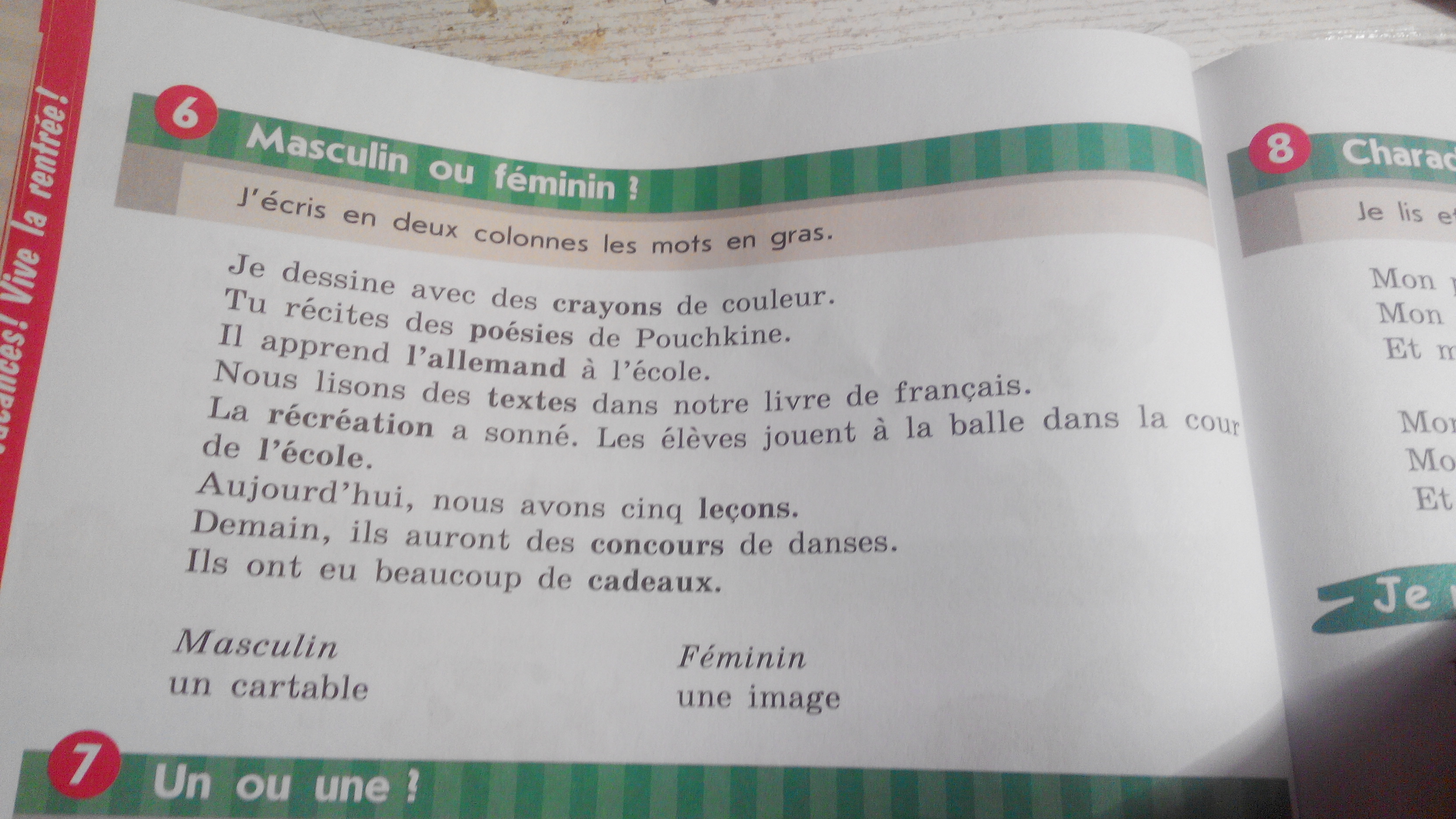 Féminin: une poésie, (une langue) allemand, une récréation, une école, une leçon