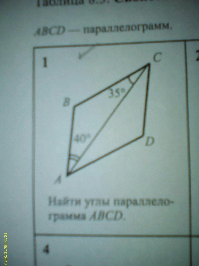 Угол DAC равен углу BCA и равен 35° ( BC параллельно AD, из определения параллелограмма). Также для другого угла. Угол BAD = 75°, угол BCD=75°. Два других найдем по формуле: 360°--2×75°= 210°. Значит, каждый из них равен по 105°.