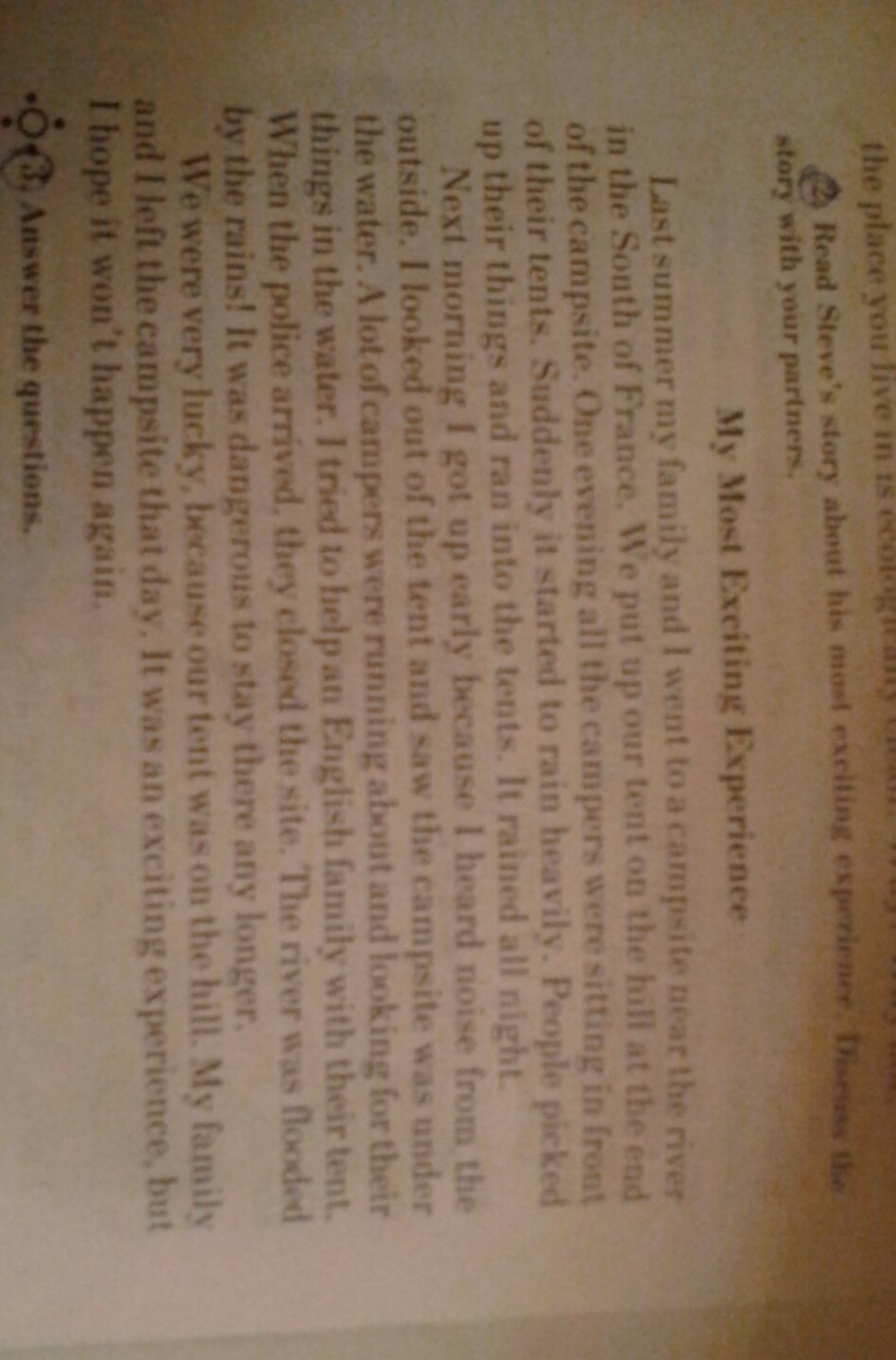 Мой самый захватывающий опыт Прошлым летом мы с семьей отправились на реку на юг Франции, где мы остановились на лагере, мы подняли палатку на холме в конце лагеря. Однажды вечером все туристы выбрали свои палатки. Внезапно он начал сильно проливать дождь. Люди разобрались со своими вещами и наткнулись дождем. На следующее утро я встал рано, потому что слышал шум снаружи. Я выглянул из палатки и увидел, что кемпинг находится под водой. Многие туристы бегали и искали свои вещи в воде. Он помог английской семье с их палаткой. Когда полиция прибыла, они закрыли сайт. Река была затоплена дождями! Было опасно оставаться там, Нам очень повезло, потому что наша палатка была на холме. В этот день мы с семьей покинули лагерь. Это был захватывающий опыт, но я надеюсь, что этого больше не повторится.