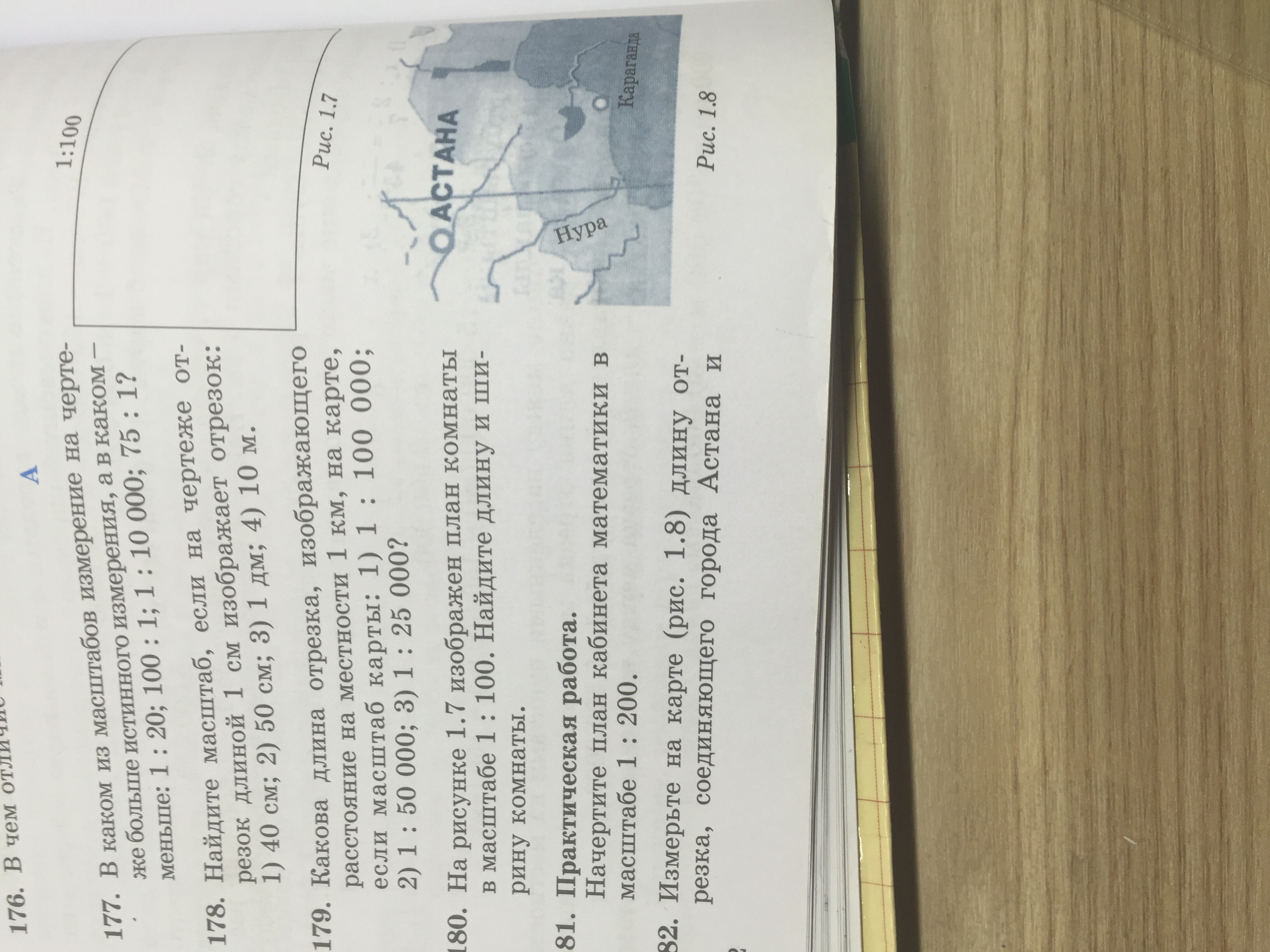 Масштаб 1:100 означает, что в 1 см плана 100 см комнаты, то есть 1 метр. Возьми линейку, измерь длину прямоугольника на рис. 1.7, умножь на 1 м- получишь длину комнаты в метрах. Измерь ширину прямоугольника, умножь полученное значение на 1 м- получишь ширину комнаты. По твоей фотографии мы этого сделать не можем, так как чертёж не виден полностью.