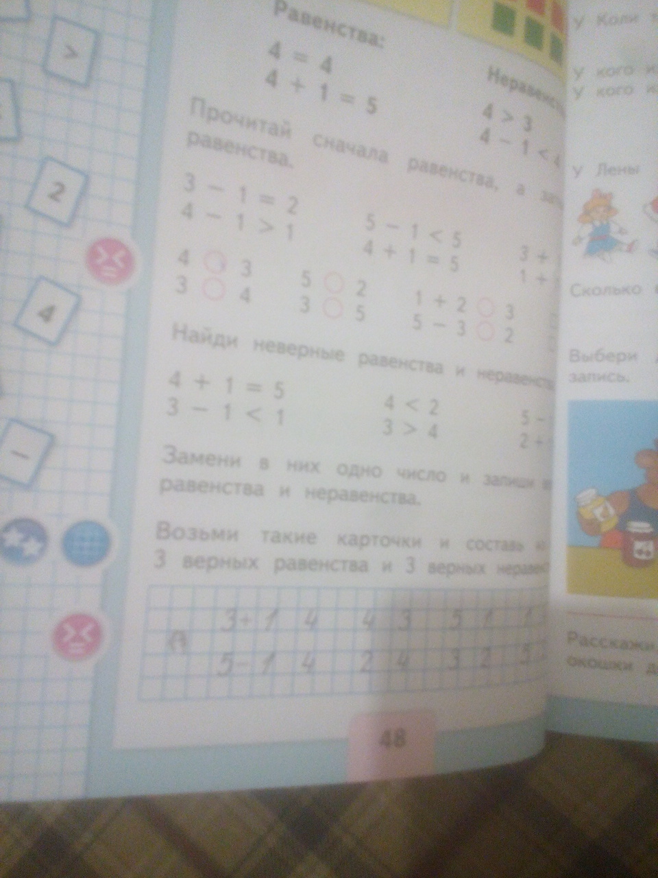 возьми такие карточки и составь из них 3 верных равенства и 3 верных не равенства