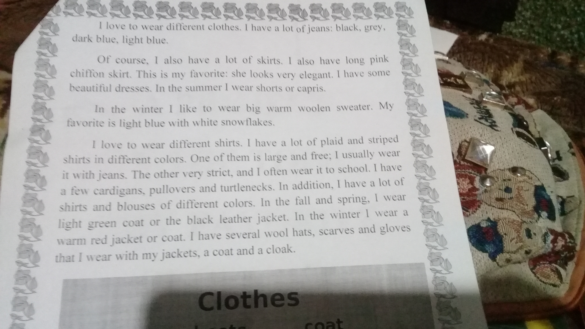 темно-синий, голубой. Конечно, у меня есть много ский, у меня также есть длинная розовая юбка из шиилона. Это мой любимый клип, который очень ciegart 1 имеет некоторые платья из хауттитула. Летом наденьте шорты или капри. Зимой мне нравится носить большой теплый шерстяной ругань. Мой любимый - лилий синий с белым snowilakc3. любить носить dinermi shins выкладывает много плед и полосатых рубашек в ярких красках, один из них большой, и я обычно ношу его с джинсами. Другой очень строгий, andlofien носить его в школу, это несколько кардиганов, пуловеры и водолазки. Кроме того, у меня есть много рубашек и блузок или цветных цветов осенью и весной, я ношу светло-зеленое пальто или черную кожаную куртку. Зимой носите теплую красную куртку или пальто. У меня есть несколько шерстяных шляп, шарфов aud Eloves, которые носят с моими куртками, пальто и одеколоном Одежда 3AKPblTb