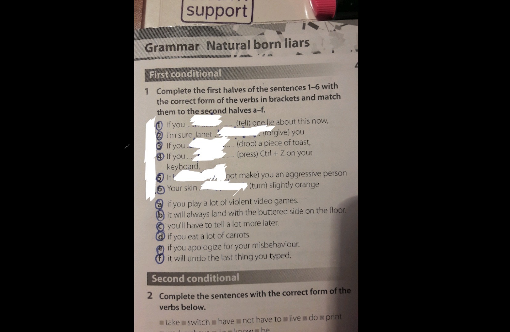 1c tell 2e will forgive 3b drop 4f press 5a won’t 6d will turn