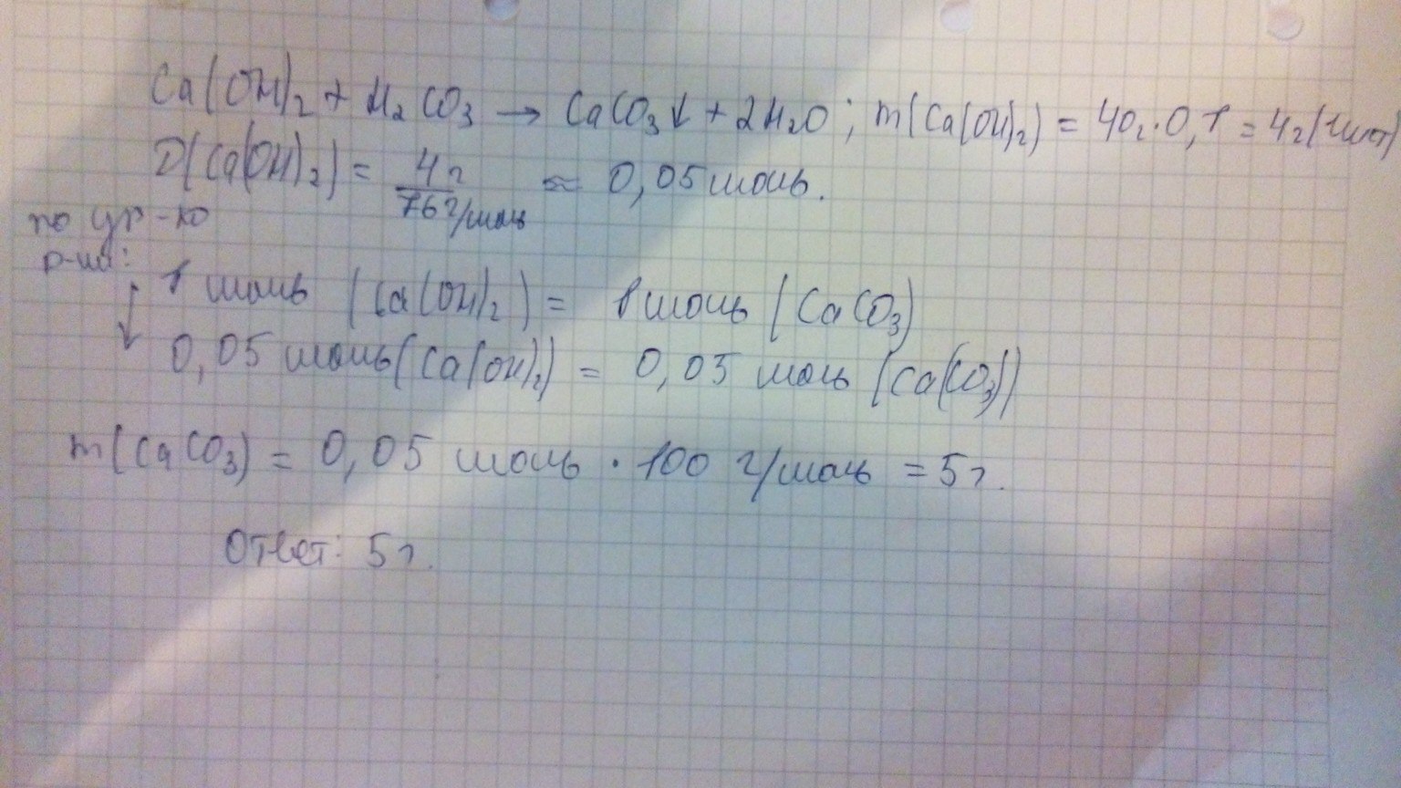 Вычислите массу соли которая образуется при взаимодействии 40 г раствора с масовой часткой Ca(OH)2 10% c H2co3