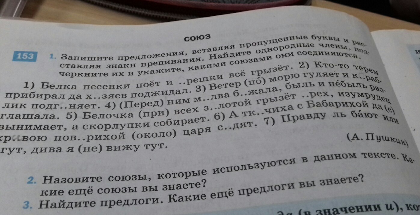 1.и орешки, 2.хазяев поджидал. 3. Ветер по морю гуляет и кораблик подганяет. 4. Перед ним м..лва бежала. 5.золотой грызет орех. 6. А ткачиха с Бабарихой да е кривою поворихою около царя седят. 7. я не вижу тут