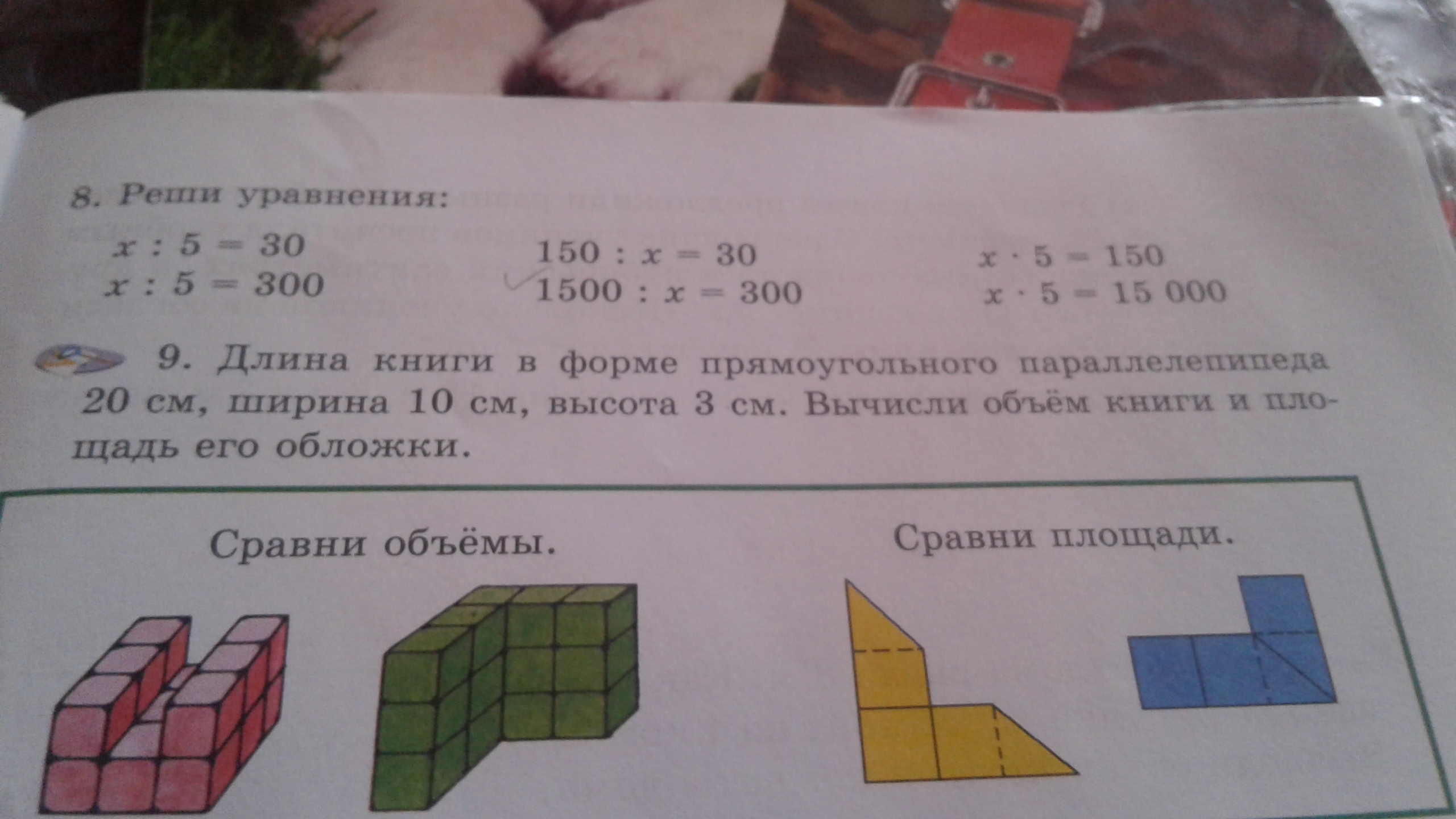 1) 20 x 10 x 3 = 600 (см3) - объём книги. 2) (20 x 10) x 2 + (3 x 20) = 460 (см2) - площадь обложки.