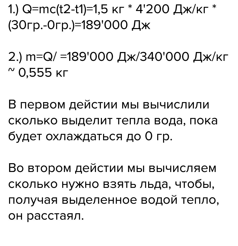 В воду массой 1,5 кг положили лед, температура которого 0'с Начальная температура воды 30'с, сколько нужно взять льда, чтоб он весь растаял?