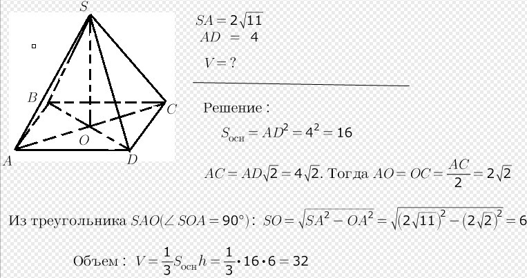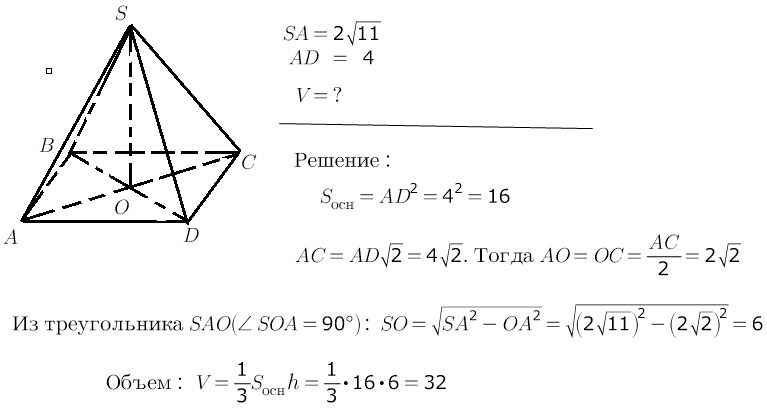Найдите объём правильной четырёхугольной пирамиды, сторона основания которой равна 4, а боковое ребро равно 2 корень из 11