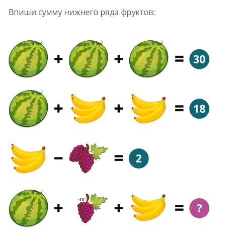 2. Арбуз = 10, бананы - одинаковые числа, значит (18-10):2=4 - 4 банана