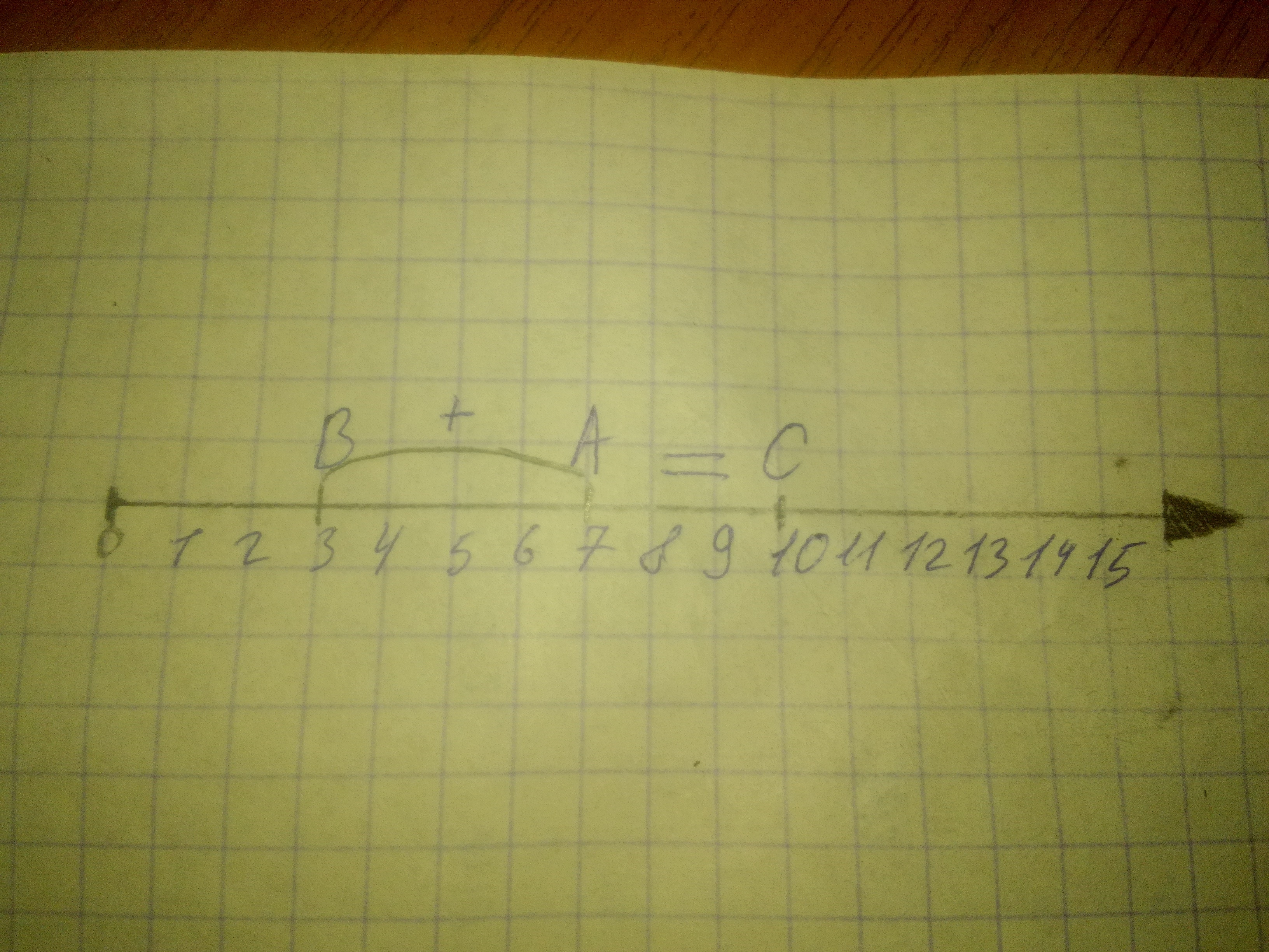 Начертите координатный луч. Отметьте на нем точки A 7 и B 3. Покажите как построить точку C координатой которой является суммой координат данных точек.