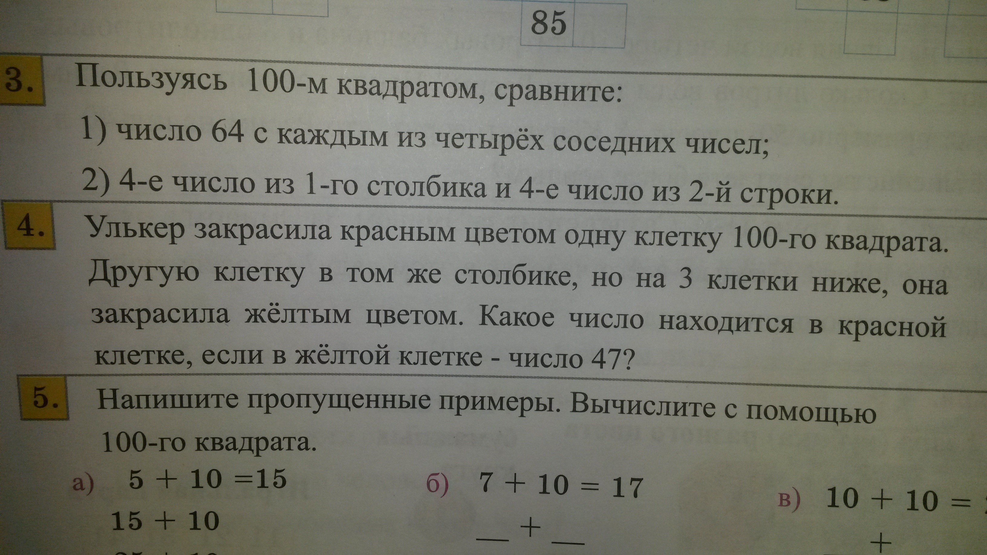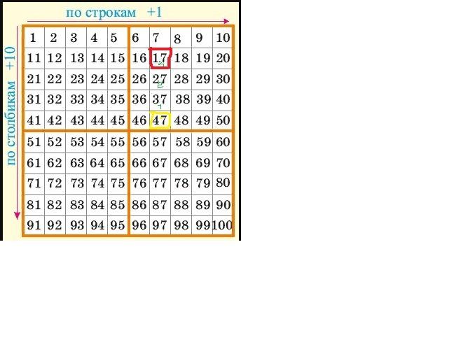 В числе в клетке желтого цвета десятков на три больше, так как оно расположено на три клетки ниже.