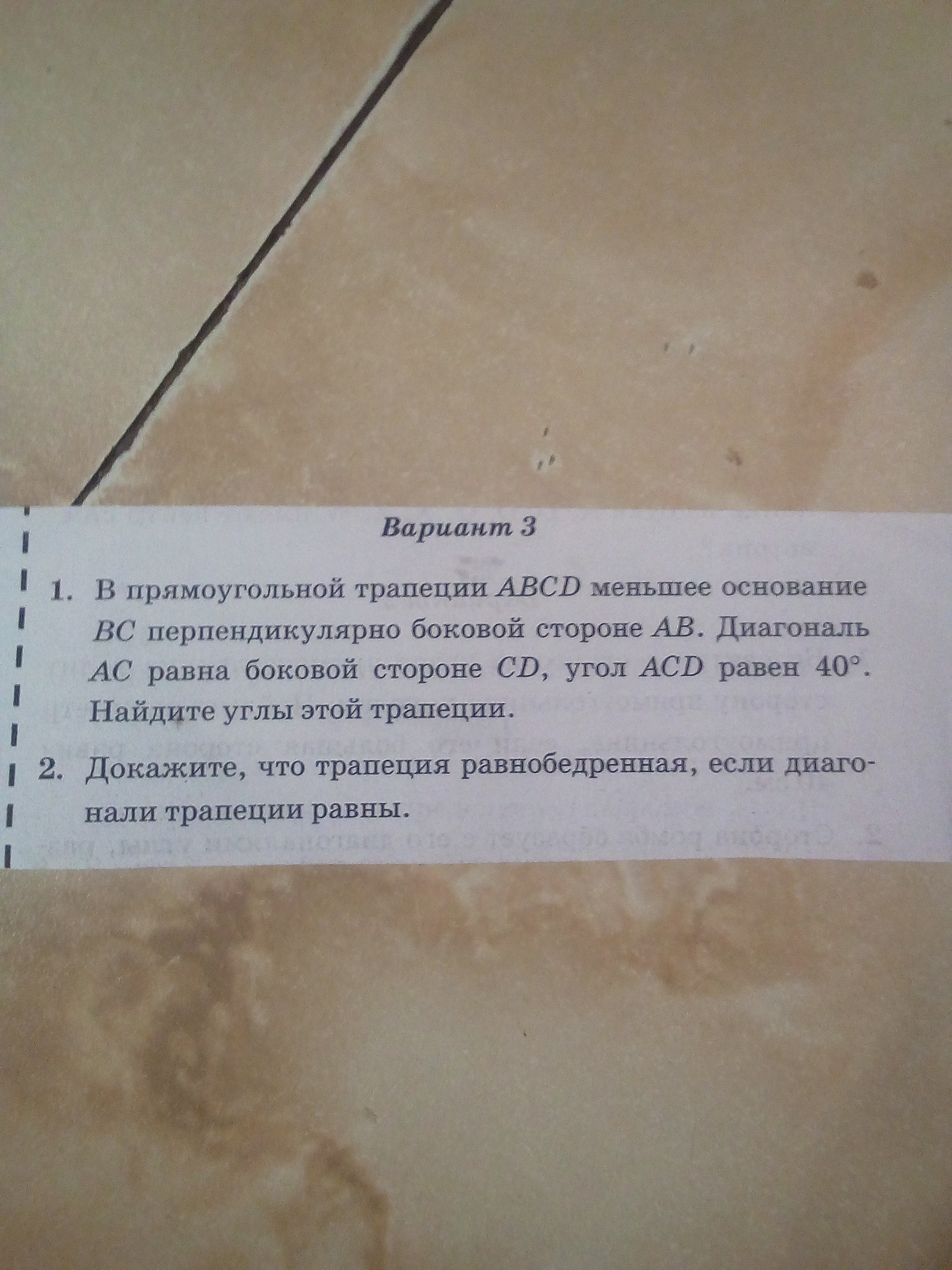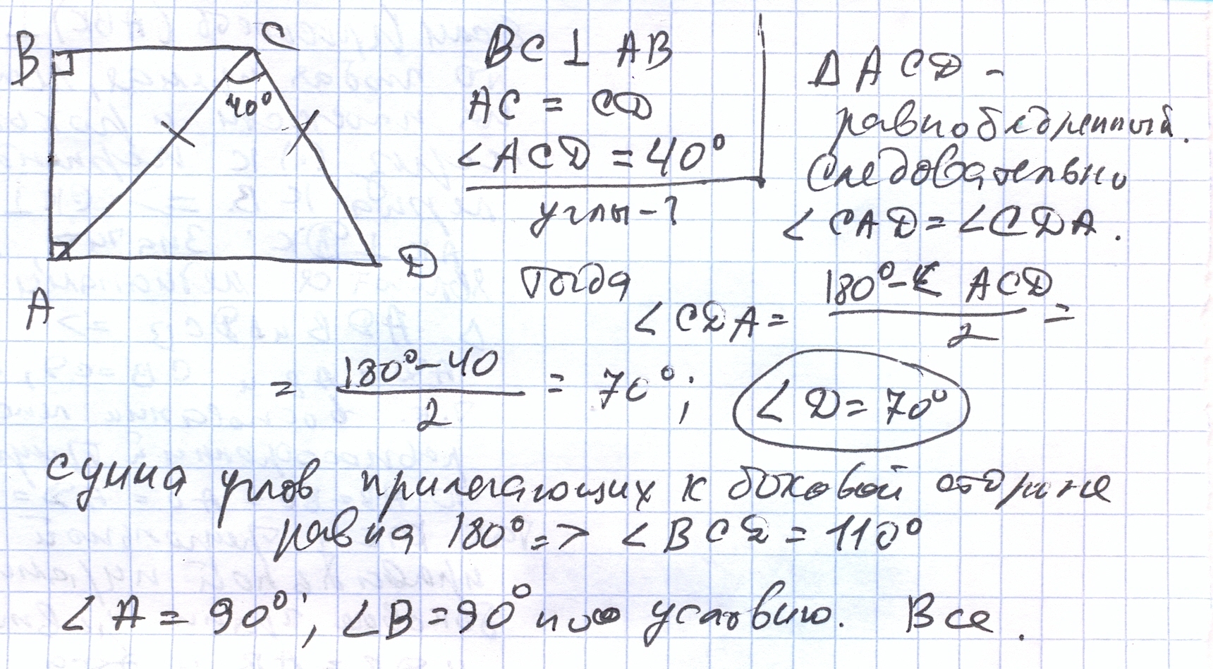 На прямоугольной трапеции ABCD меньшее основание BC перпендикулярно боковой стороне AB. Диагональ АС равна боковой стороне CD, угол ACD равен 40 градусов. Найдите угол этой трапеции