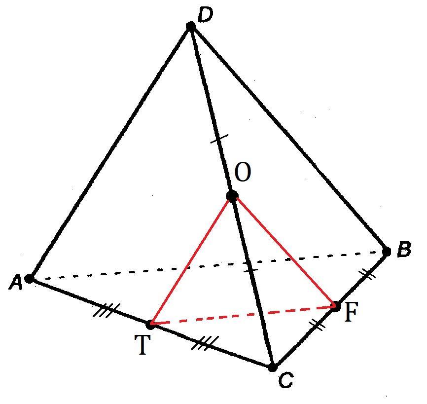Точки F, O и T - соответственно середины ребер BC, DC и AC тетраэдра DABC. Периметр треугольника FOT равен 12 см. Вычислите площадь боковой поверхности тетраэдра.