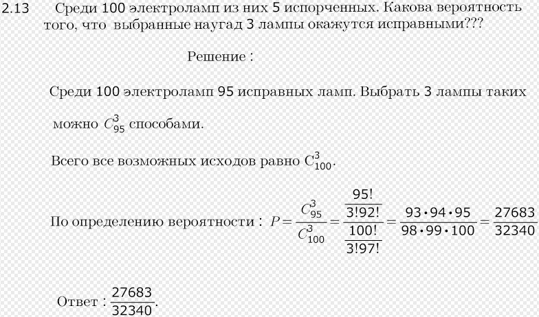 Среди 100 электроламп и 5 испорченных. Какова вероятность того, что выбранные наугад 3 лампы окажутся исправными???