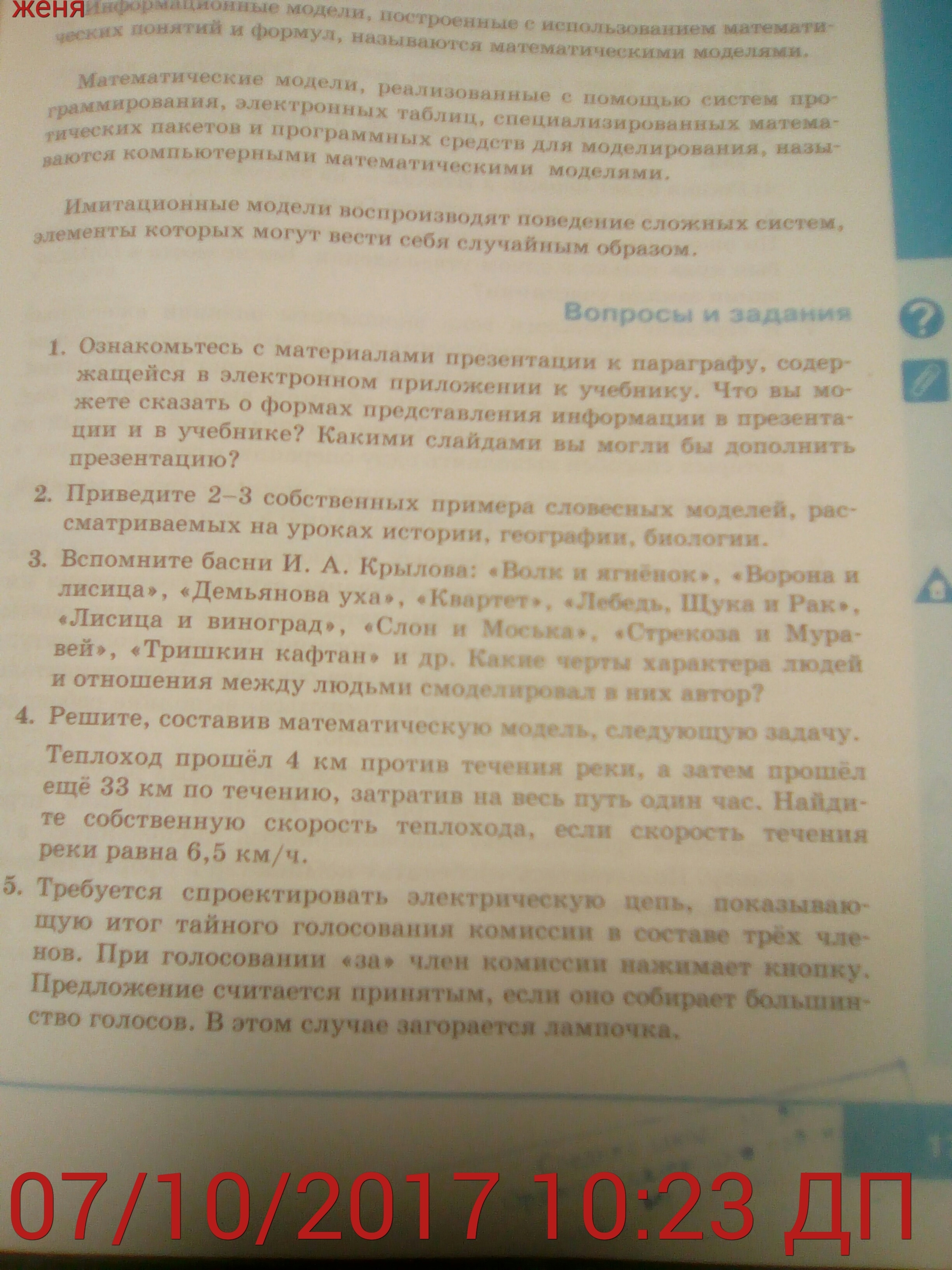 математическая модель это формула. Обозначим скорость теплохода Vт, скорость реки Vр, первый участок движения S1, t1, второй участок движения S2, t2. t1=S1/(Vт-Vр), t2=S2/(Vт+Vр) t=t1+t2. Решить уравнение с одним неизвестным...