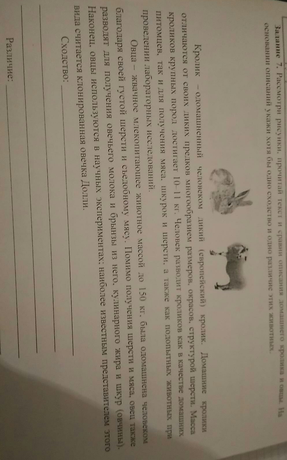 Рассмотри рисунки.Прочитай текст и Сравни описание домашнего кролика и овцы.На основании описаний укажи хотя бы одно сходство и одно различие этих животных