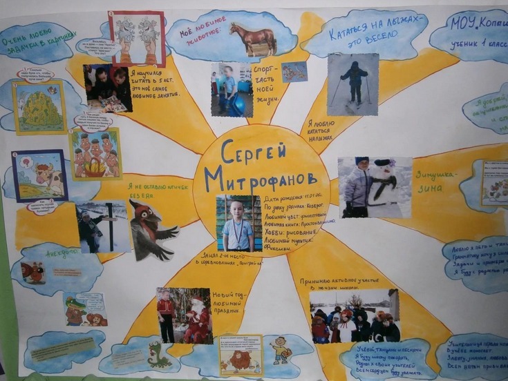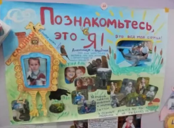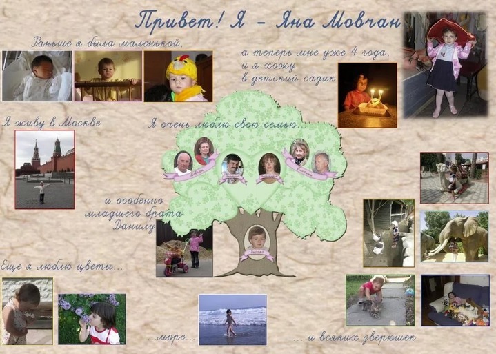 Вот тебе примеры..пишешь типо "здравствуйте это я или познакомтесь это я" потом клеишь свои фотки и пишешь каков ты?Например: я очень люблю гулять со своей собакой(порода) или я очень люблю играть с сестренкой/братиком..