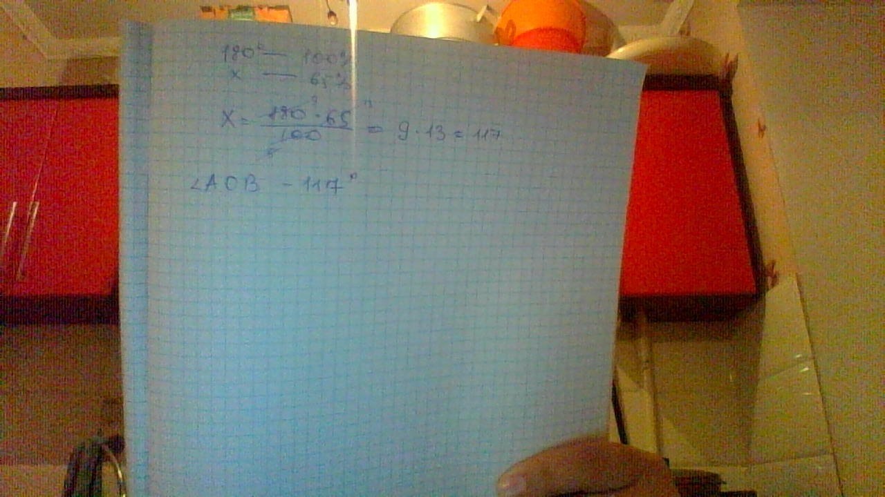 AOB бұрышының градустық өлшемі жазыңқы бұрыштың 65%-іне тең. AOB бұрышының градустық өлшемі неше градус?