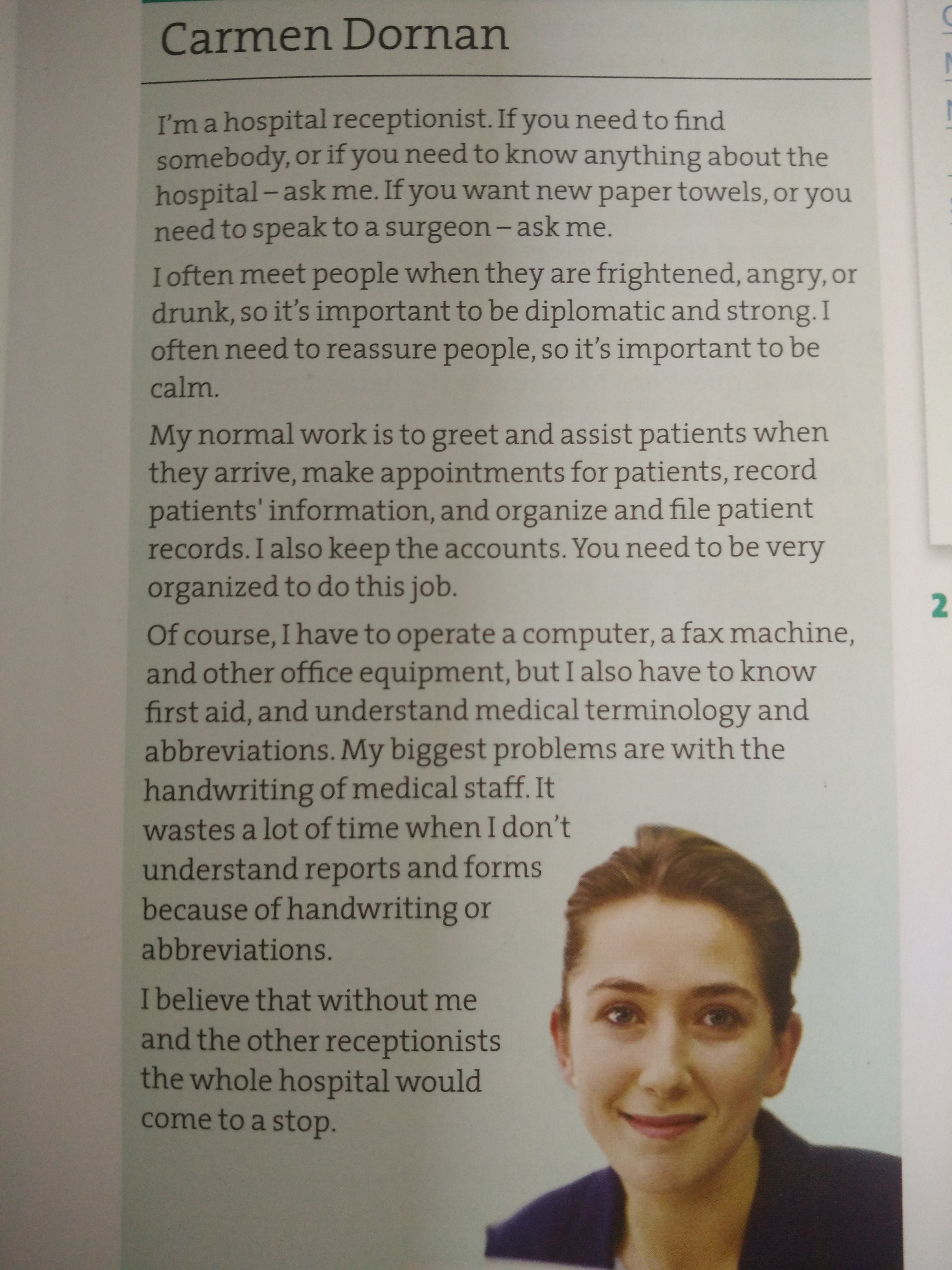Разумеется, я должна управлять компьютером, факсом и другим офисным оборудованием, но тем не менее, я должна знать правила первой медицинской помощи и понимать медицинские термины и аббревиатуры. Моя самая большая проблема с распознаванием почерка на медицинских бумагах. Это занимает много времени, когда я пытаюсь распознать отчеты и документы.