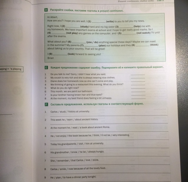 1) Write to youto tell you my news.2) Study hard and my big sister.3) Help me with my homework. 4)hot play. 5) hot watch. 6)you. 7)plan. 8)think. 9) look.
