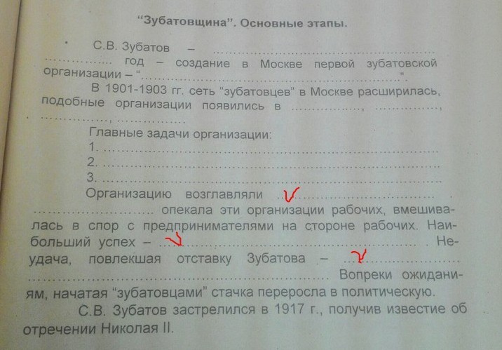 Но для успеха зубатовской идеи власть должна была сделать что-то реальное для рабочих. Государство же ограничило свою «покровительственную» политику законом «Об учреждении старост в фабричных предприятиях» (июнь 1903 г.). Рабочие могли избирать из своей среды старосту, следящего за исполнением предпринимателем условий найма. Зубатовская теория не запрещала рабочим участвовать в экономических забастовках, поэтому в прокатившейся в 1902 — 1903 гг. широкой стачечной волне члены зубатовских организаций приняли активное участие. Это вызвало недовольство фабрикантов. В правительство посыпались жалобы на «рискованные эксперименты». С. В. Зубатов был отправлен в отставку.