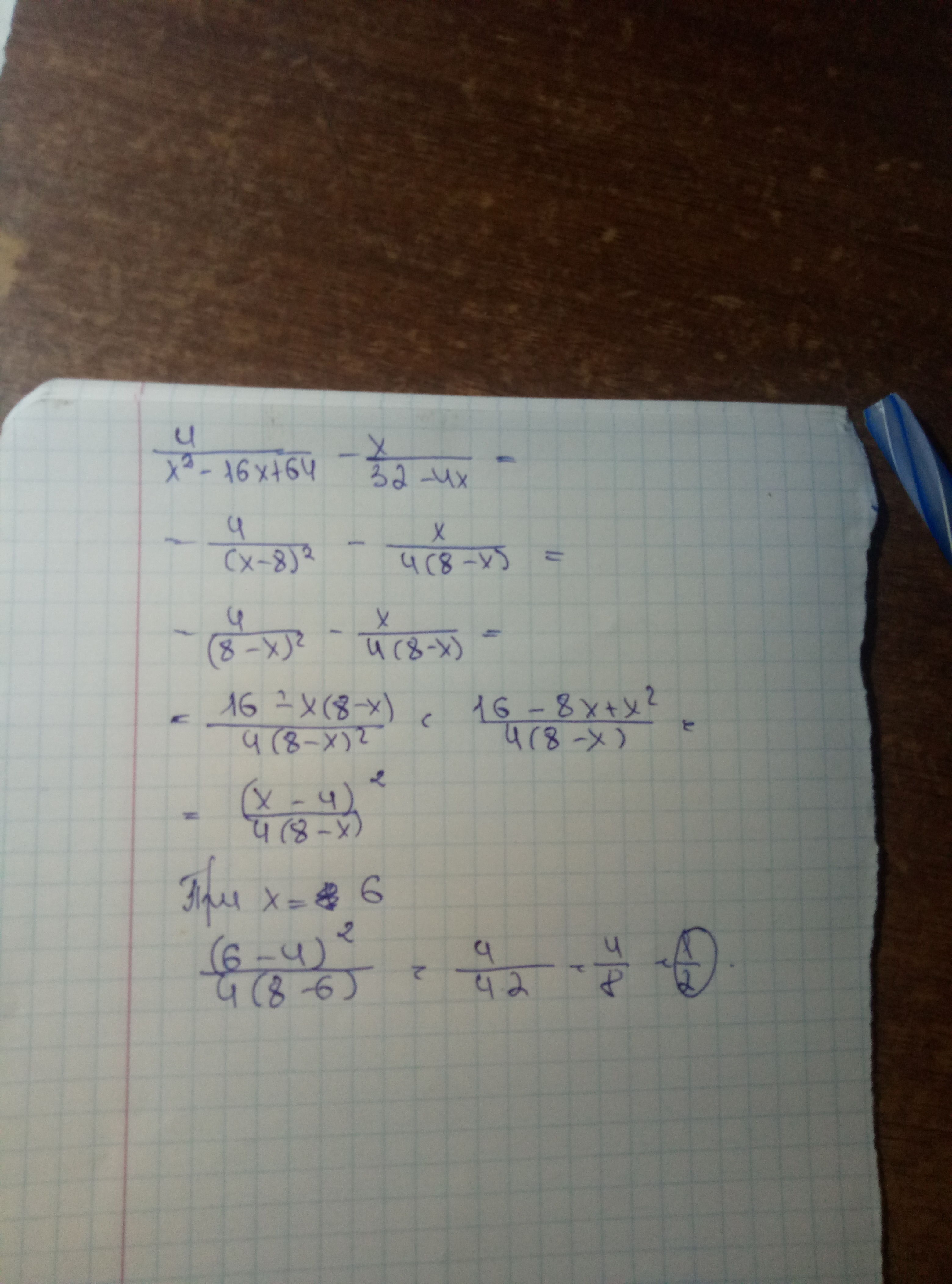 1) найдите значение выражения 4/(дробь) x^2-16x+64 - x/32-4x ... при х=6