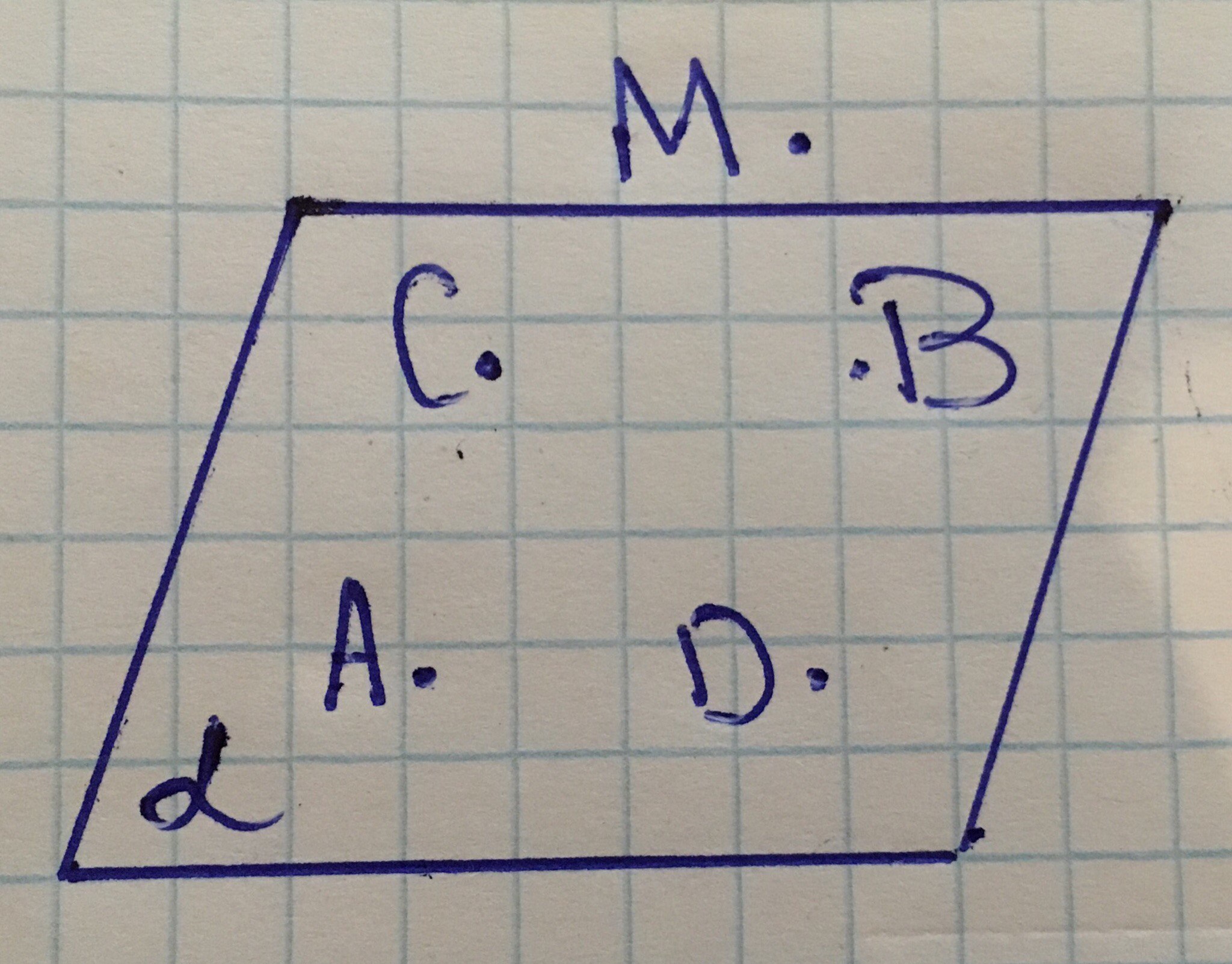 На рисунке плоскость α (альфа) содержит точки A,B,C,D ,но не содержит точку M. Постройте точку K - точку пересечения прямой AB и плоскости MCD. Лежит ли точка K в плоскости α (альфа) ?
