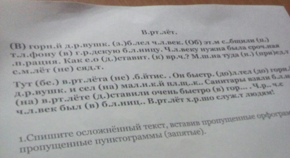 Тут без вертолета не обойтись. Он быстро долетел до горной деревушки и сел на маленький плющик (может и не плющик, трудно определить) . Санитары взяли ********(не видно слово) на вертолете, доставили очень быстро в горы. Через час человек был в больнице. Вертолет хорошо служит людям!