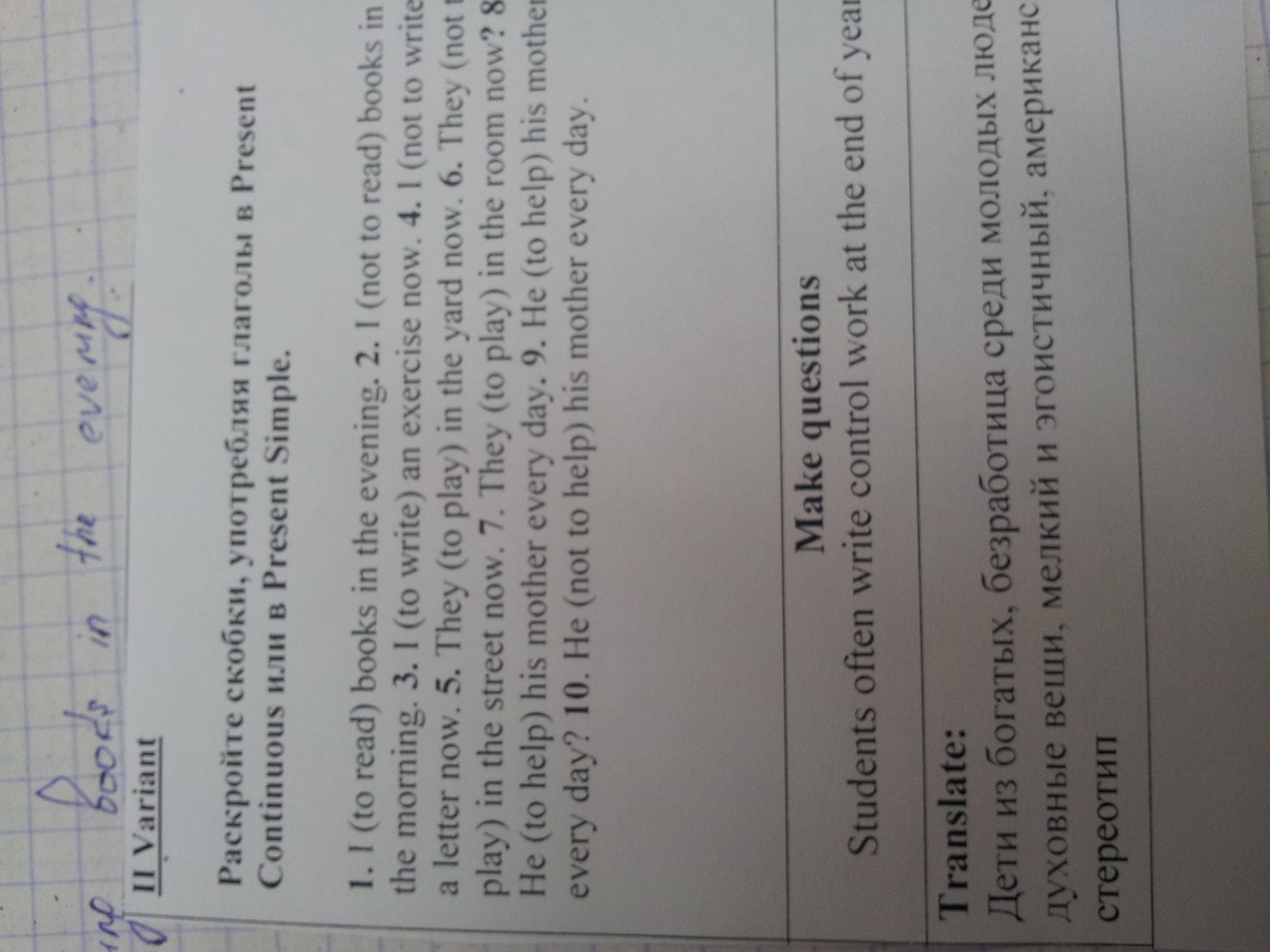 1. i read, i don't read, i'm writing, i'm not writing, they play, they are not playing, are they playing in the room now?, he helps his mother.., does he help his mother...?, he doesn't help... .