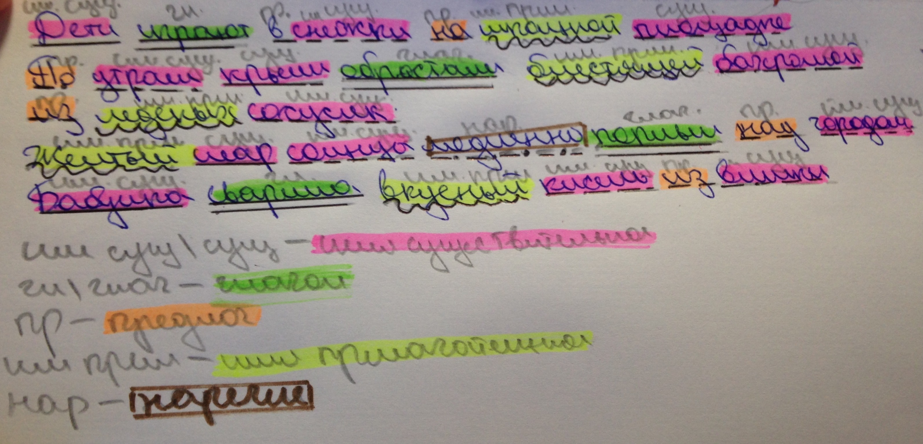 Я для того , чтобы было лучше видно существитьельные выделила розовым, глаголы зеленым, предлоги оранжевым , а прилагательные желтым. А члены предложений ручкой черной