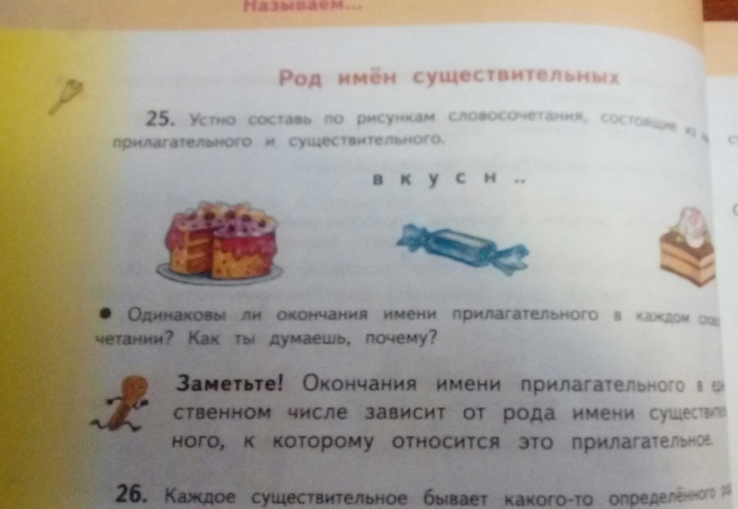 запиши составленные словосочетания по рис .25. Над существительными укажи род. выдели окончания в словах.