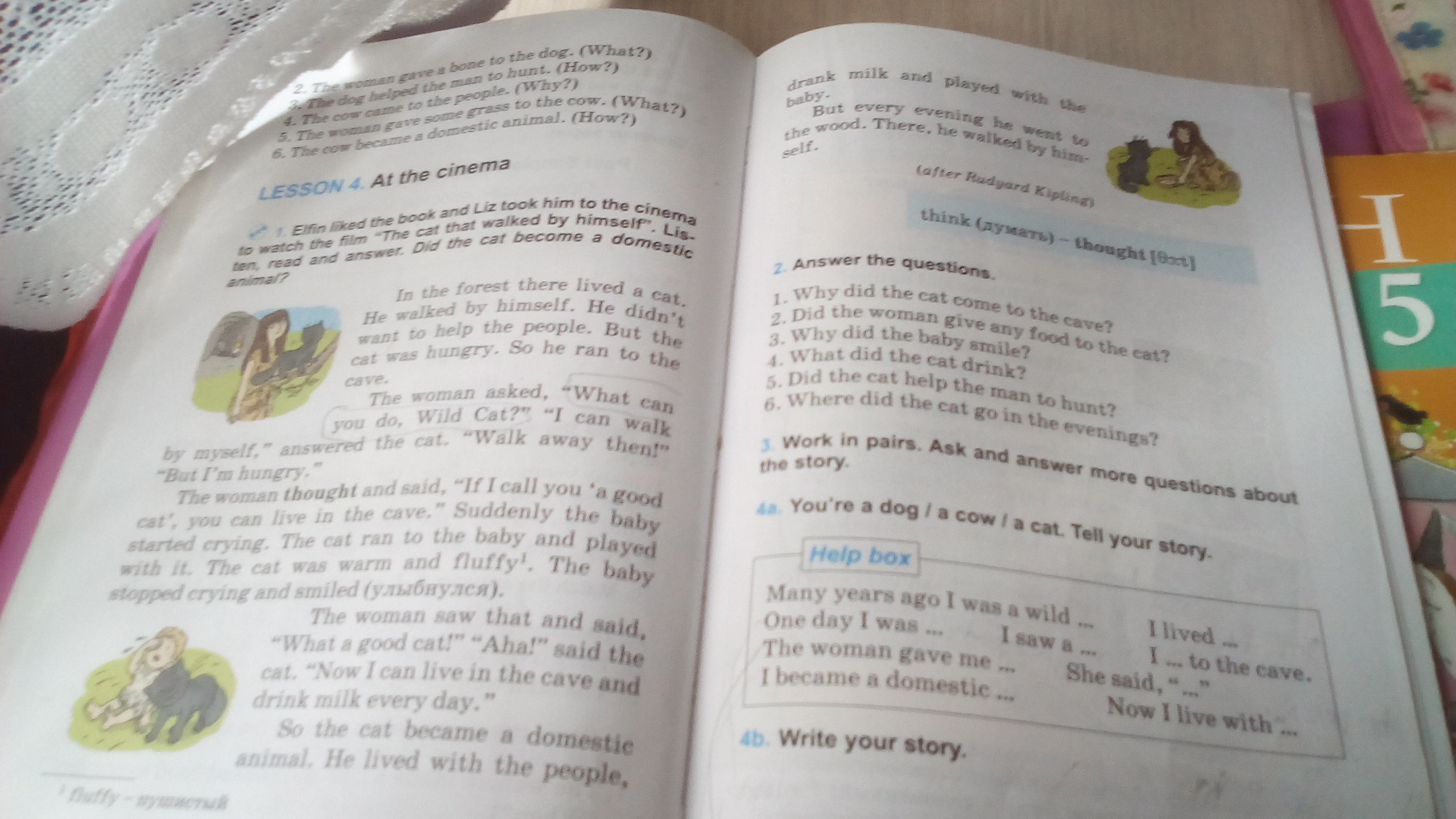 1.Здесь в лесу жил кот. Он ходил сам по себе. Он не хотел помогать людям. Но кот был голоден. Так он побежал в пещеру.