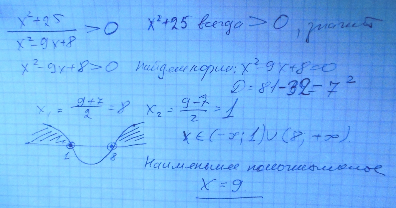 найдите наименьшее целое положительное значение x при котором выражение x2+25/(x2-9x+8) положительно