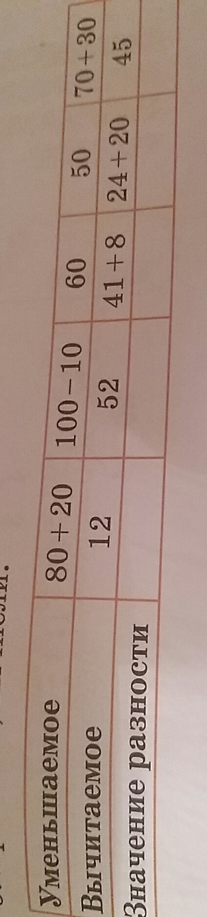 Уменьшаемое 100,90,60,50,100.Вычитаемое 12,52,49,44,45.Значение разности 88,38,11,6,55