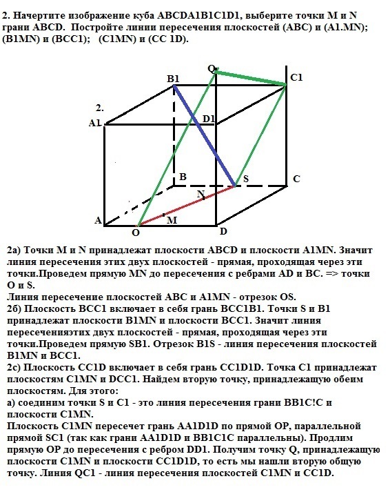 .2. Начертите изображение куба ABCDA 1B 1C 1D1, выберите точки М и N грани ABCD. Постройте линии пересечения плоскостей (ABC) и (A1.MN); (B1MN) и (ВСС1); (С1MN) и