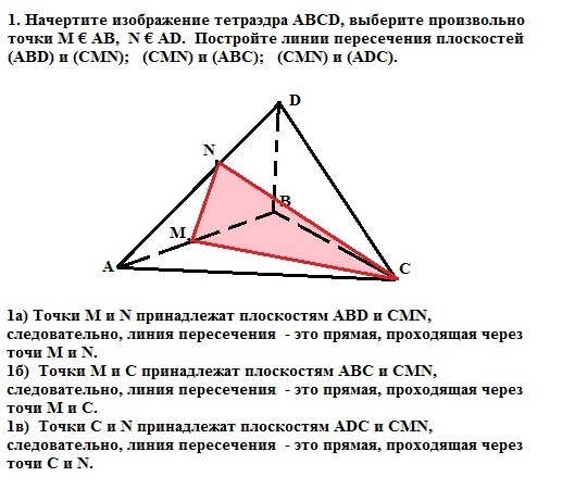 1. Начертите изображение тетраэдра ABCD, выберите произвольно точки М € АВ, N € AD. Постройте линии пересечения плоскостей (ABD) и (CMN); (CMN) и (ABC); (CMN) и (ADC).