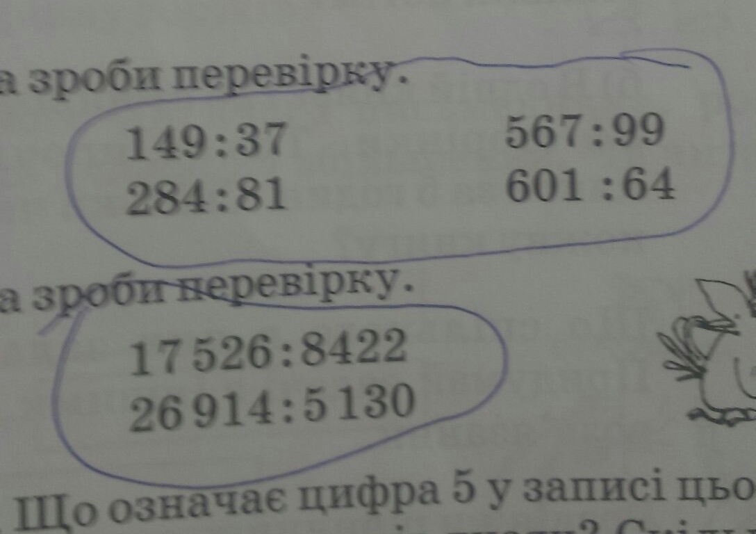 149 : 37 = 4 (остаток 1) 284:81=3 (остаток 41) 567 : 99 = 5 (остаток 72) 601 :64 = 9 (остаток 25) 17 526 : 8422 = 2 (остаток 682) 26914 : 5130 = 5 (остаток 1264)